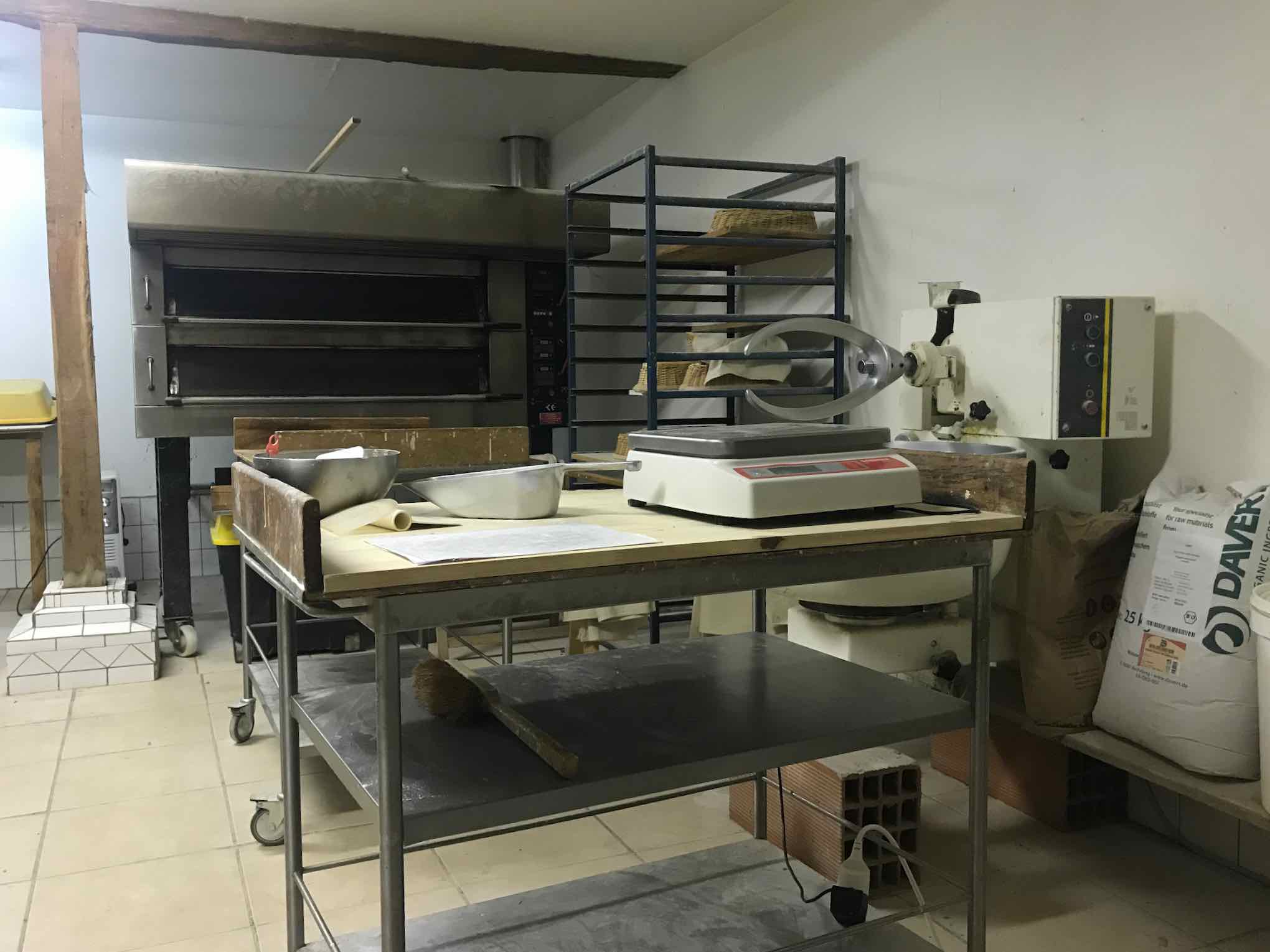 Un four à pain professionnel (électrique), un pétrin à vitesse lente, des moules, des bassines et des paniers constituent l'essentiel du fournil de Laurent.